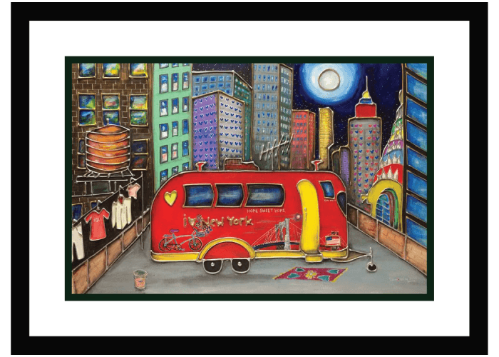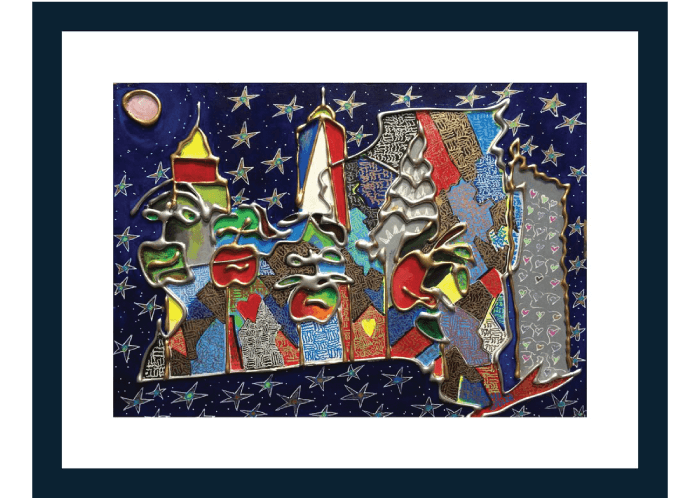 Finally, after years of framing other artists’ work, Shadin traveled full circle to the joys of his youth by rediscovering his own artistic passion, turning his boyhood hobby into a practical career opportunity. He eagerly dove into his own artwork, creating a unique style that playfully combines a pop art sensibility with folk art. He works with acrylics, epoxies, plastic, paper, and most important of all his enthusiastic spirit. Shadin’s 3-D collage pieces have steadily gained the attention of art lovers everywhere, and in August 2011 they were featured on NY1 when he was named New Yorker of the Week.